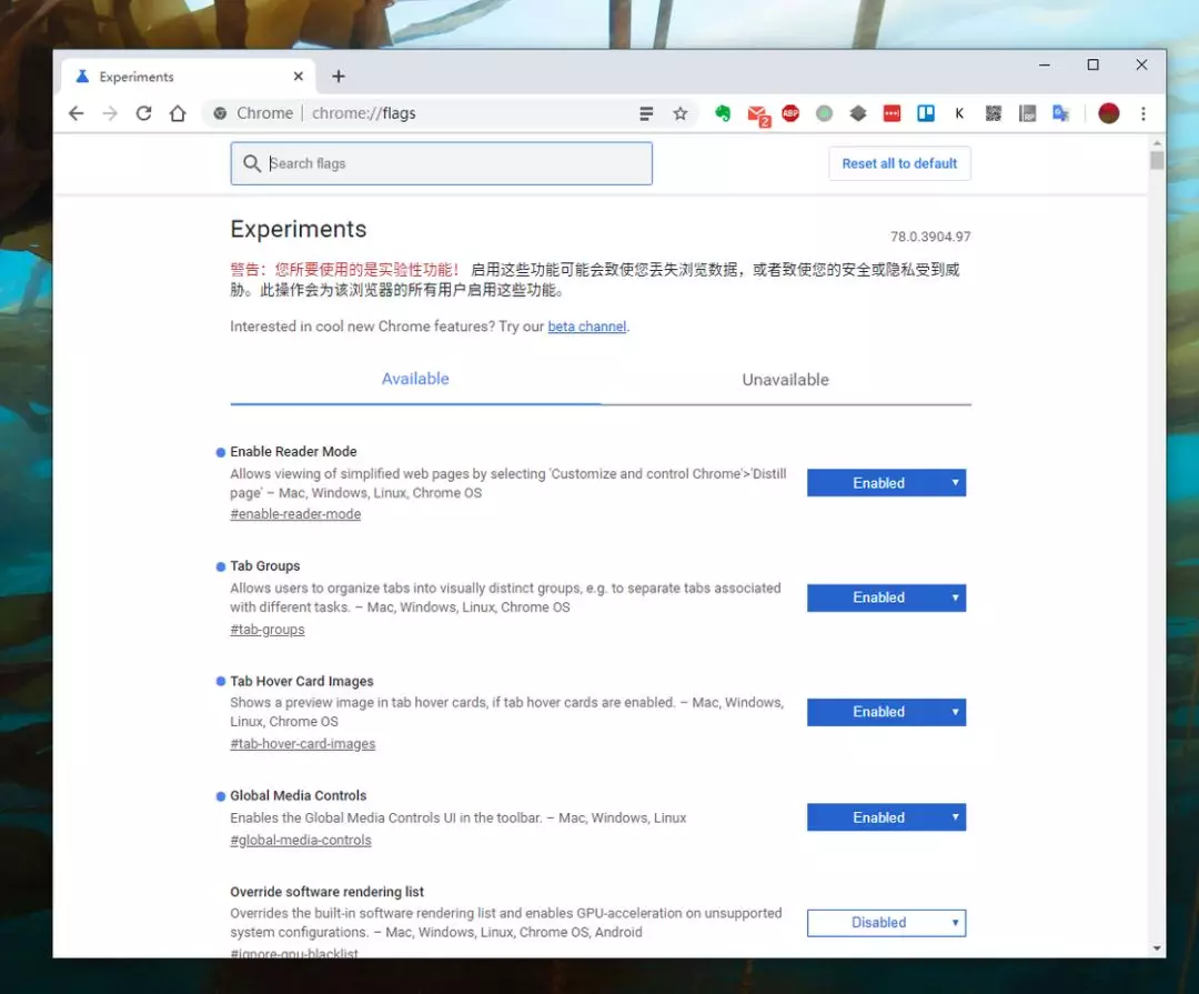 当然因为桌面端 Chrome 的广泛使用性,新功能的推出和运用反而会更为谨慎。如果想要尝鲜新功能一样是通过 Feature flags —— 当然比起移动端,桌面端的新功能主要针对的键鼠操作,和移动端有相当大的区别。