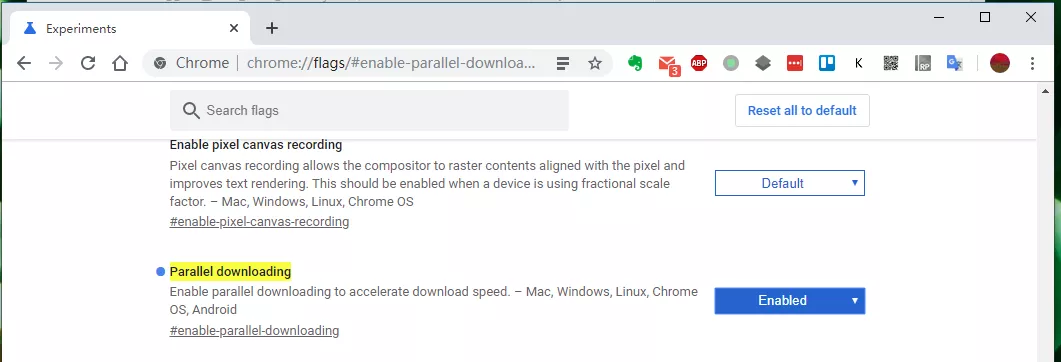 开启方法和移动端一样, 在 Chrome flags 上搜索「Parallel downloading」来开启 Chrome 的并行下载功能,你可以尝试下大个文件以及多个文件,你会发现速度会提高那么一些。当然如果有条件的话,选择第三方下载工具进行资源下载反而更为合适。