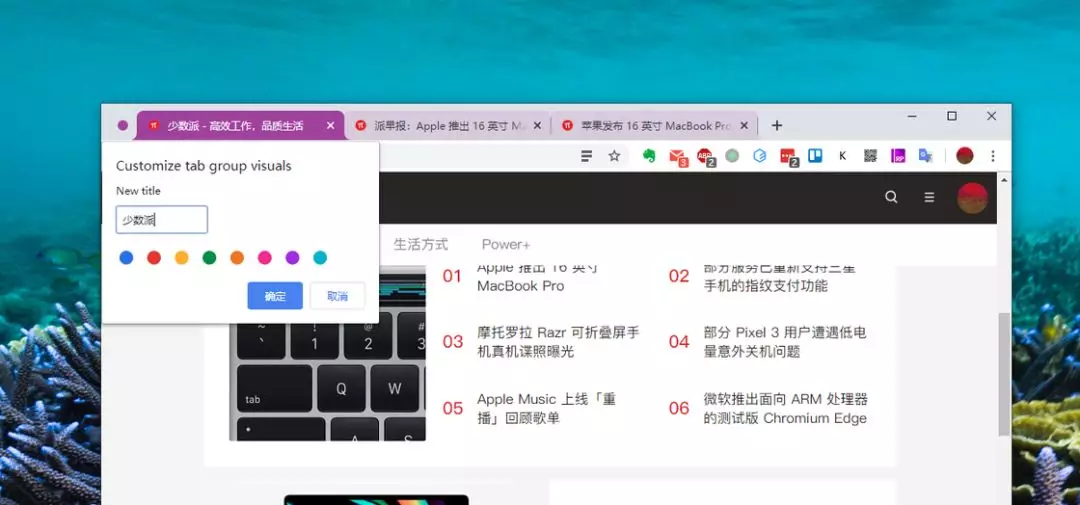 这个很实用的功能同样也是默认隐藏,需要在 Chrome Flags 中搜索「Tab Groups」开启,之后将开启自动分组功能。自动分组功能将根据你的打开新标签页的方式,比如从少数派中打开的新内容页面将会自动添加到一个组中,这时会在标签页前面出现一个「组标记点」。